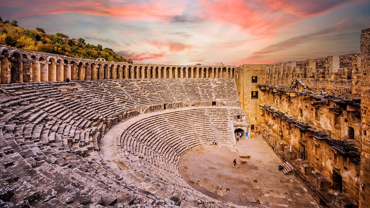 M.S. 2’nci yüzyılda inşa edilen tiyatro, 15 bin kişilik kapasitesiyle dönemin en büyük kültür yapılarından biriydi. Bugün hala orijinal akustiğini koruyor; sahnede yapılan en küçük konuşma bile üst basamaklardan duyulabiliyor. Depremler ve iklim etkilerine rağmen yapının büyük bölümü hala capcanlı duruyor.