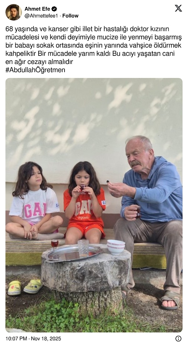 Göğüs Hastalıkları Uzmanı Ayşe Coşkun Beyan da babası için adalet istediğini ifade ederek, ‘Hem kızı, hem doktoruyum. 3 senedir akciğer kanserinde mucize yarattık. 1 hafta önce taramasını yaptık, hiçbir şeyi kalmamıştı. Sevinçle memleketlerine geliyorlardı. Benim babam bir karıncayı incitmemiş emekli öğretmendi. Çocuklarının kucağına oturup ders anlatacak kadar sevecendi. Annem, ‘Bu adam hasta’ diye yalvarmasına rağmen cani vahşice vurup durmuş. Babam yere düştükten sonra bile tekme atmaya gelmiş. Annemi sürüklemiş. Adalet istiyoruz. Bu caninin sokağa, insan içine çıkmaması lazım. Hepimiz bunlar yüzünden tehlikedeyiz. Bu işin peşini asla bırakmayacağım. Böyle bir vahşet ve canilik olmaz. Ölmüş insana tekme atılmaz. Adama arabada vurup, kapıyı açıp, sürükleyip, öldüresiye dövüp, cesedine de tekme atıyor. Babam kanseri yendi ama caniyi yenemedi. Bu işin takipçisi olacağız” dedi.