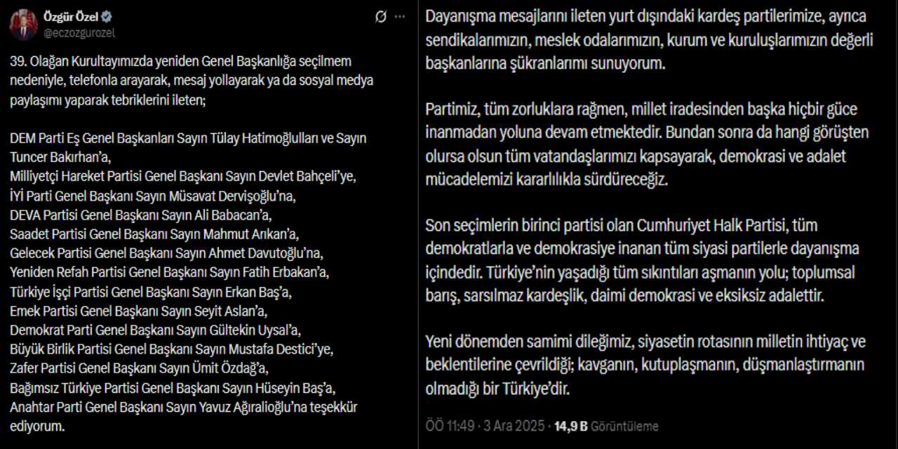 Kurultay’ın ardından mevkidaşlarından, sendikalardan, STK’lardan ve çok sayıdaki kurum ile kuruluştan tebrik mesajı aldığını ifade eden CHP lideri, sosyal medya hesabından teşekkür mesajı paylaştı.